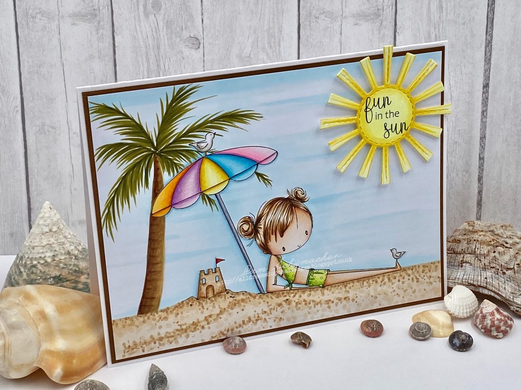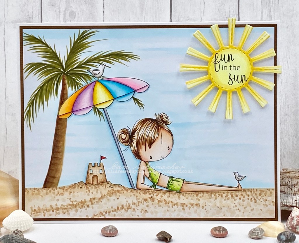 This little cutie is from All Dressed Up Stamps and is only part of the digital image called Beach Time. I masked off the snack hut as I wanted it to be just a beach scene.