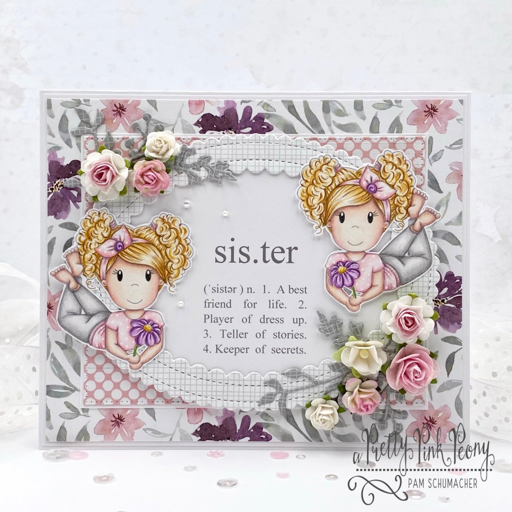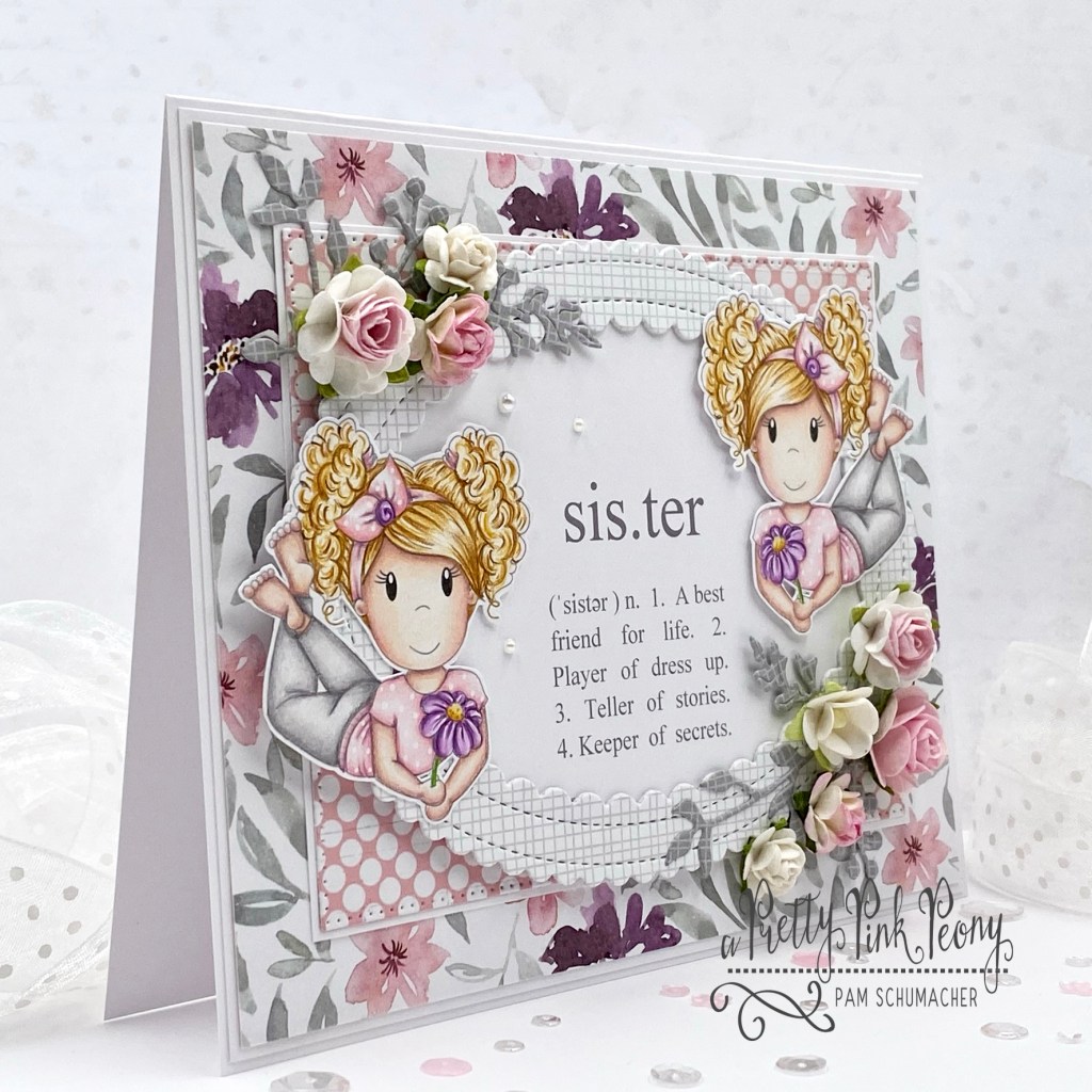 I printed two of the same image (flipping one to face the opposite direction) on plain white card stock and then colored them the same so they look like twin sisters.