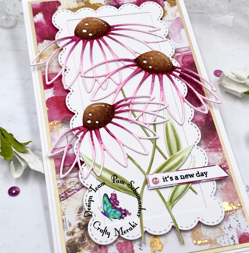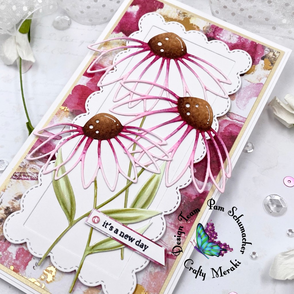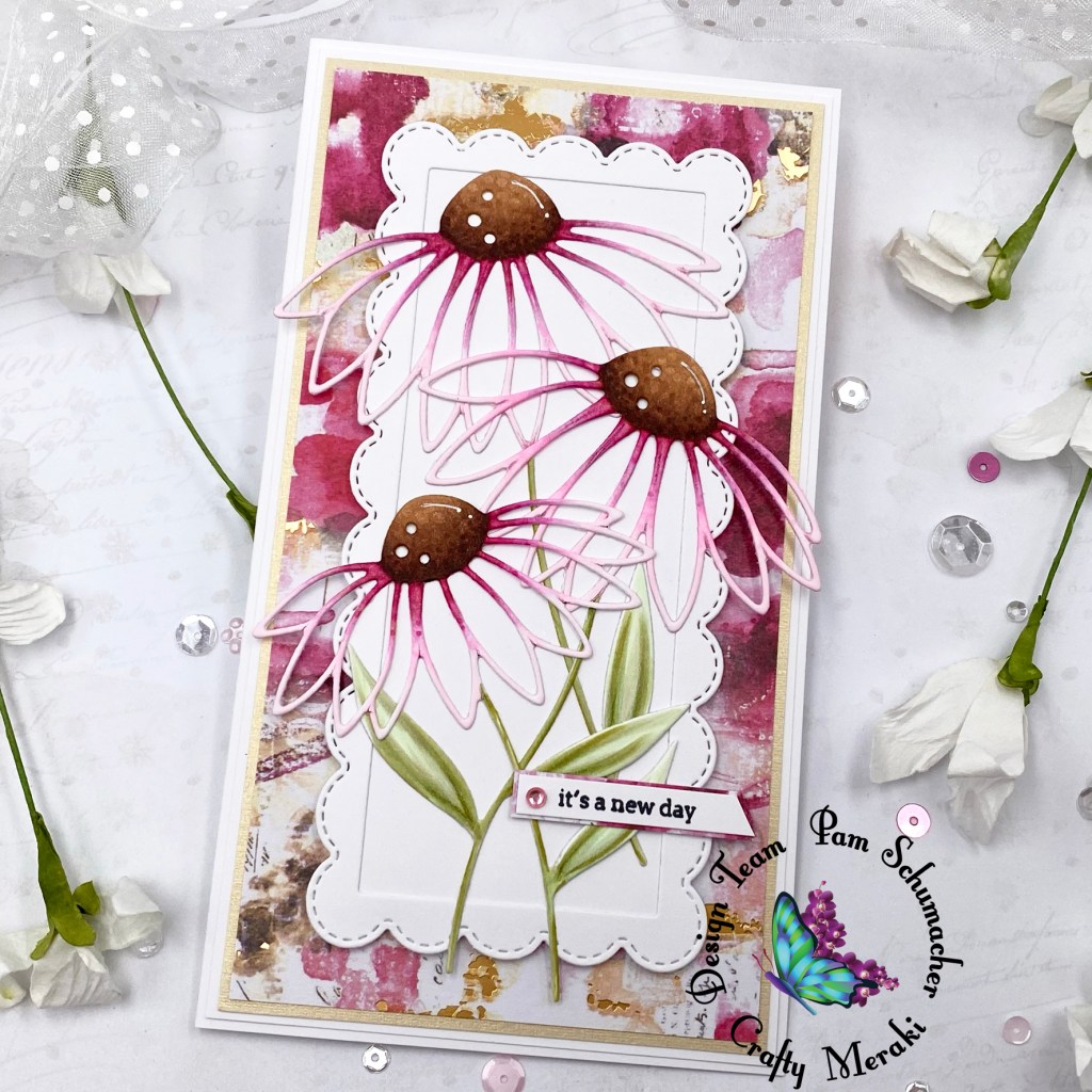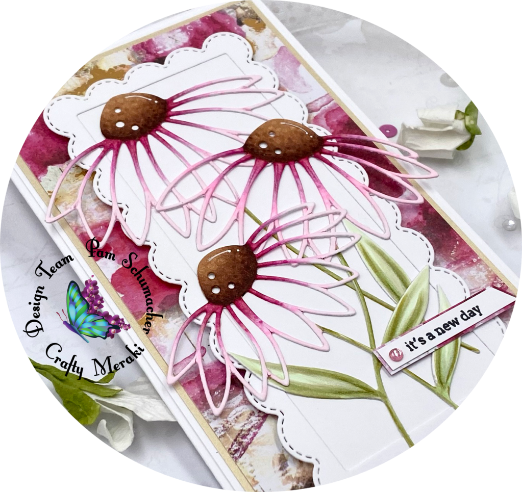 I am back today with a gorgeous floral card for Crafty Meraki. These beautiful flowers were created with a fabulous set of dies called ‘Rachel Meraki Para Dies‘. The scalloped frame die is from the die set called Timeless Frames Mini Slimline Para-Dies.