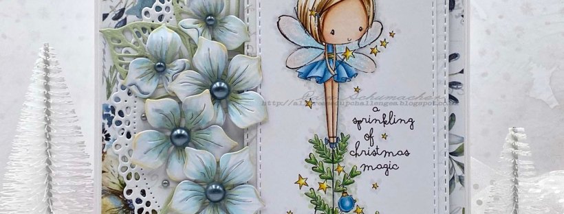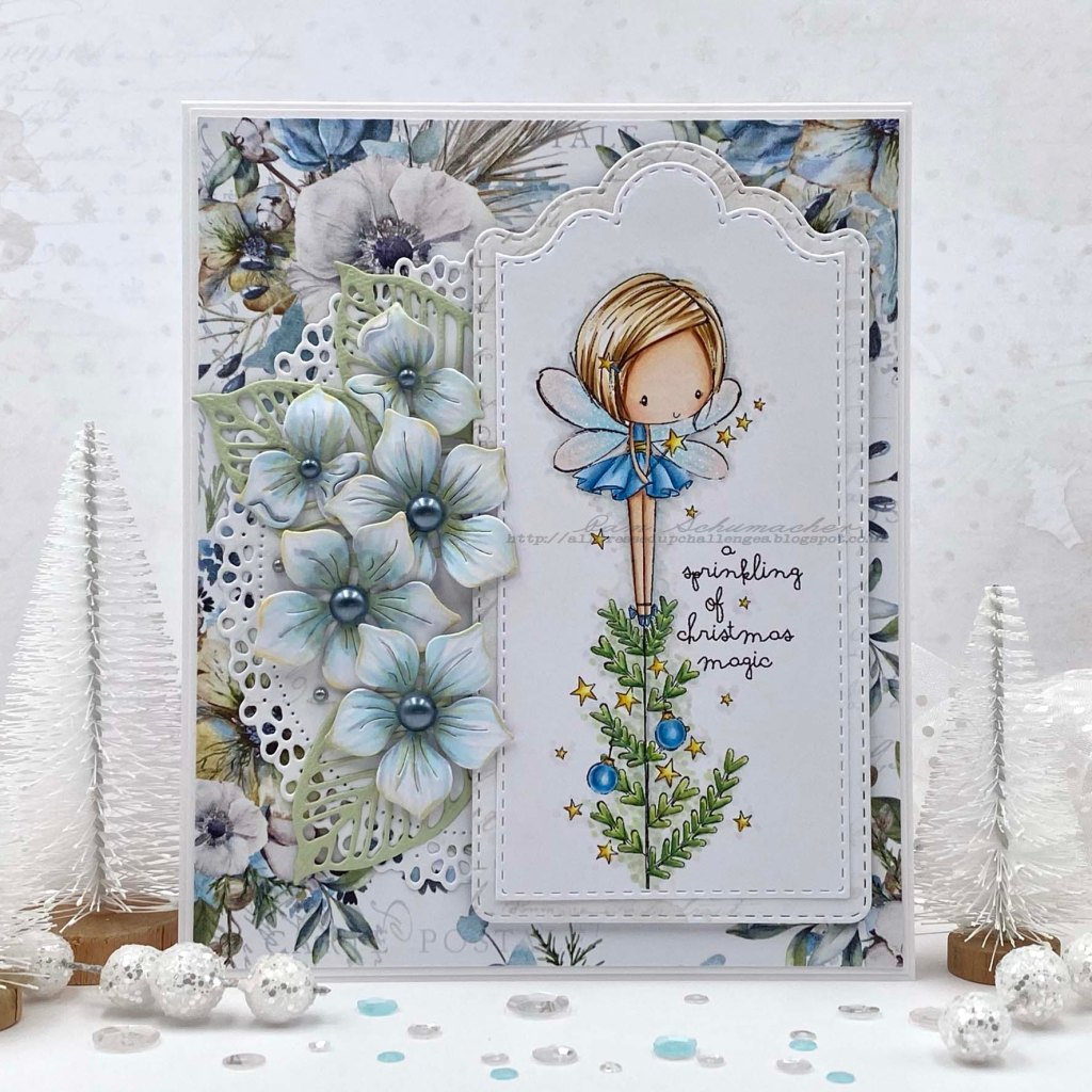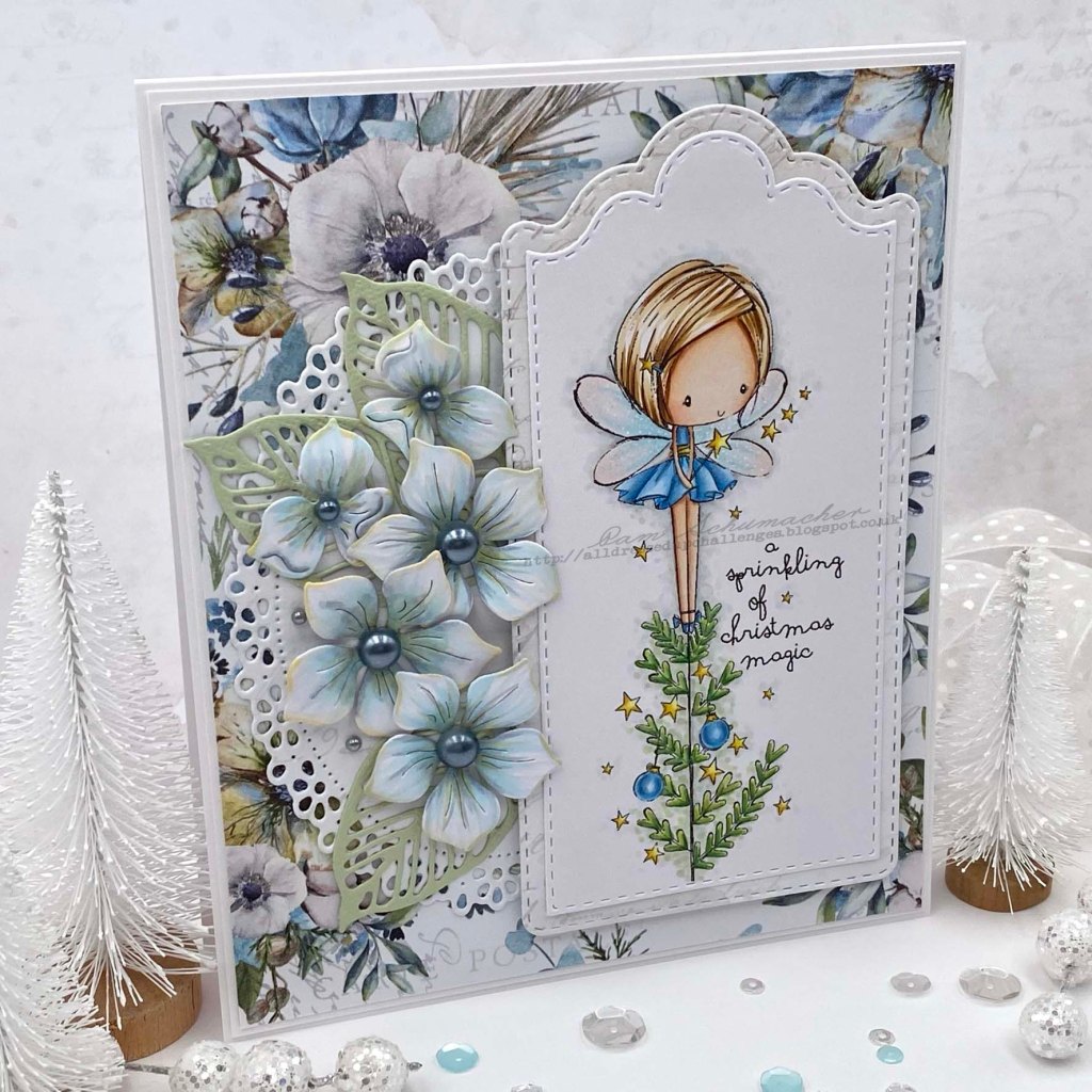 I have an adorable Christmas card to share with you today. This super sweet image called ‘Christmas Tree Fairy‘ is from All Dressed Up Stamps.
