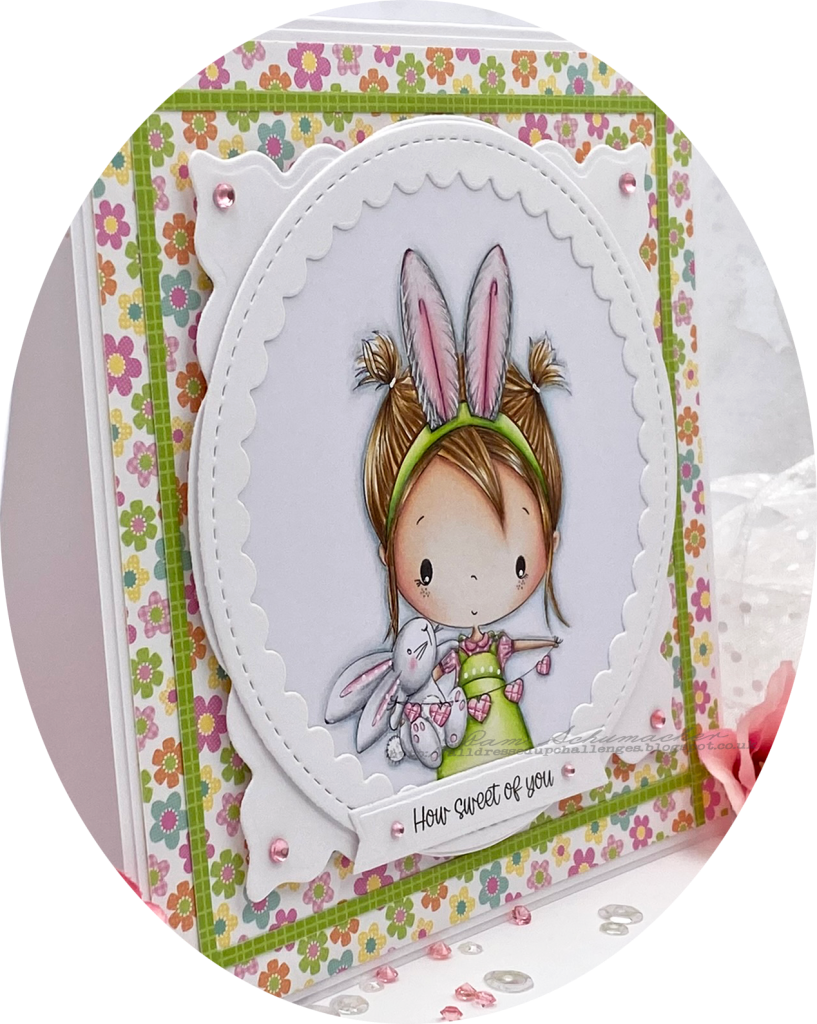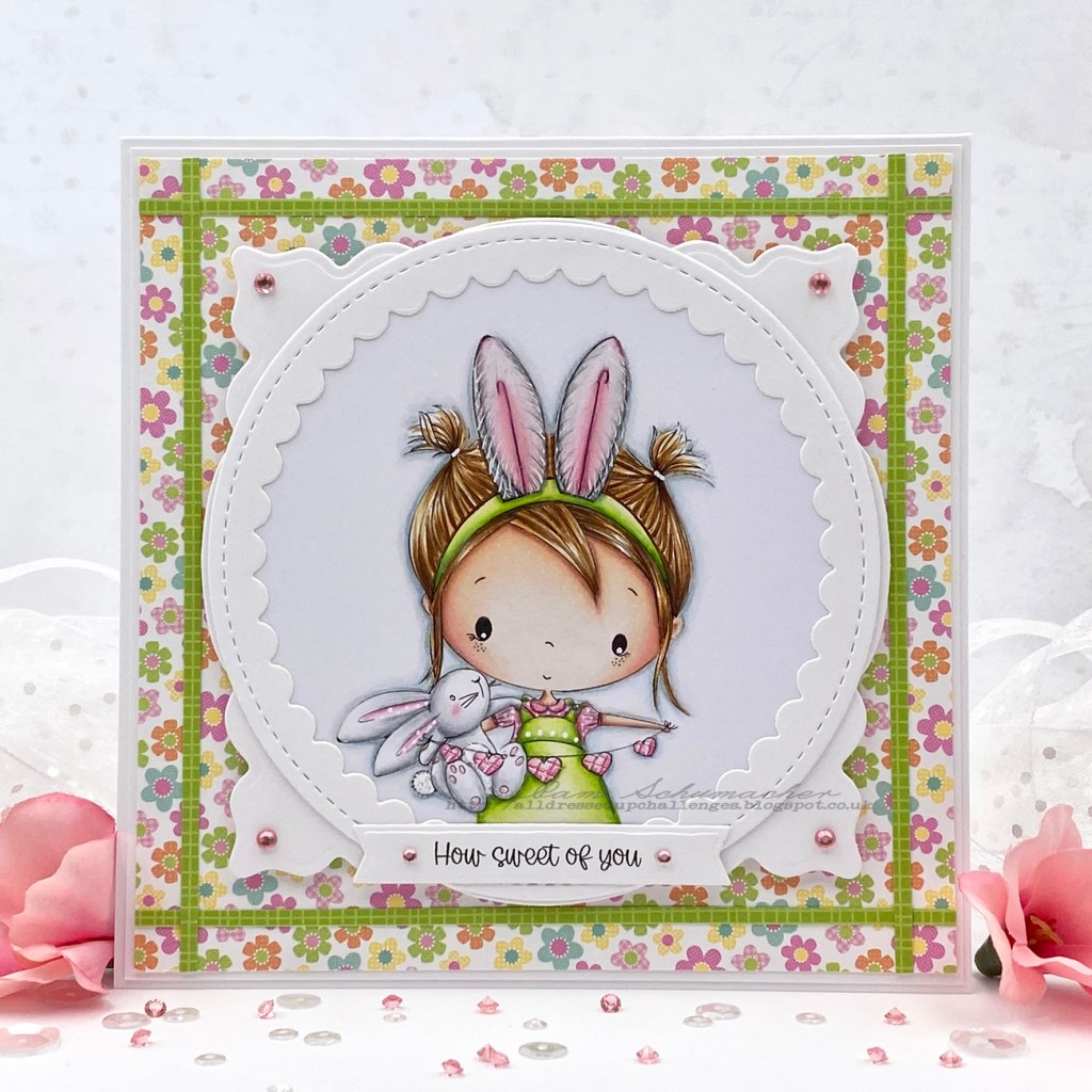 My card today features this super sweet image called Bunny Hearts from All Dressed Up Stamps. She is so adorable with her cute little bunny ears.