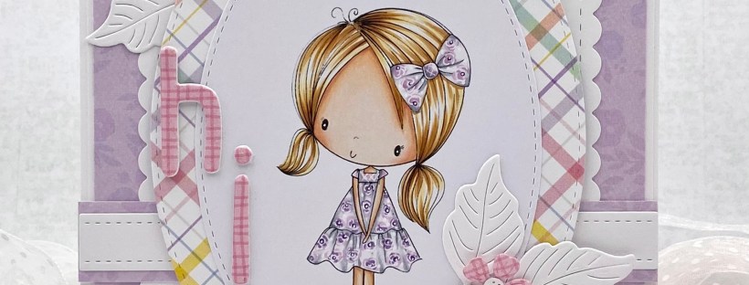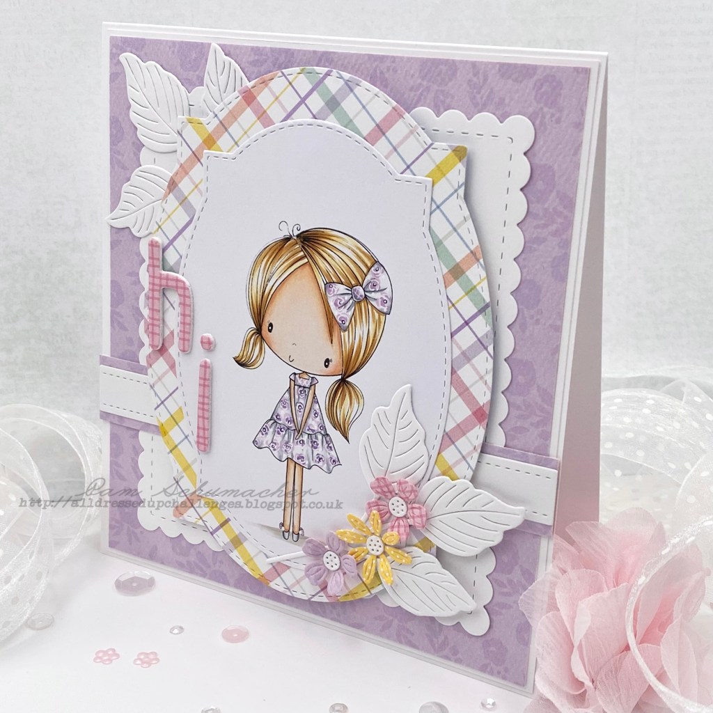 I used to love pretty flowered dresses when I was little. The full skirts with ruffles on them were the most fun to twirl around in! This little cutie pie from All Dressed Up Stamps is called ‘Love Spring Time‘. I just couldn’t resist drawing in some pretty purple flowers on her cute little dress.