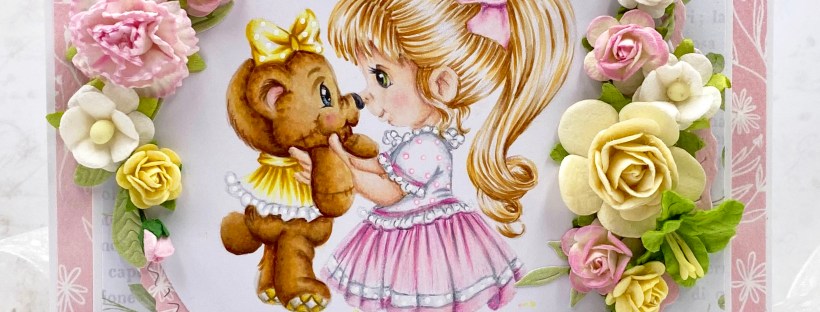 My design team card for I Am Roses features these two little cuties from Mariola Budek Art. The image is a digital stamp that you can re-size to fit your project. I also chose to change the opacity so I could color it without lines.