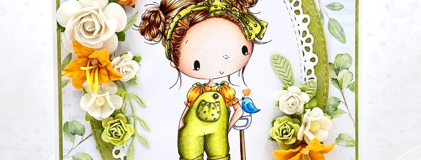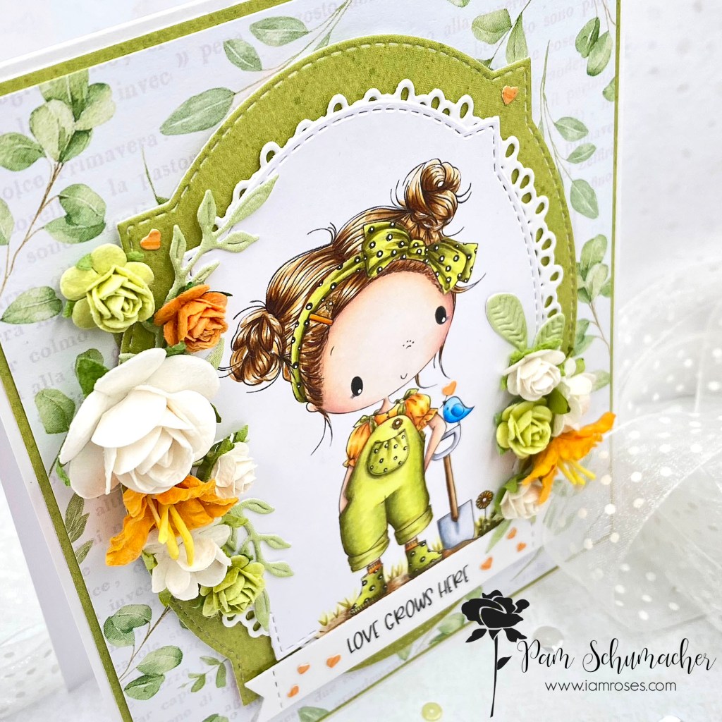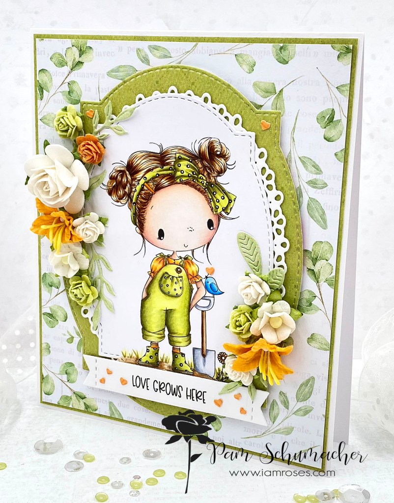 My design team card for I Am Roses today features this super sweet image from All Dressed Up Stamps called ‘Wellie Boots‘. She can bring her shovel over anytime and dig in the dirt with me…lol!