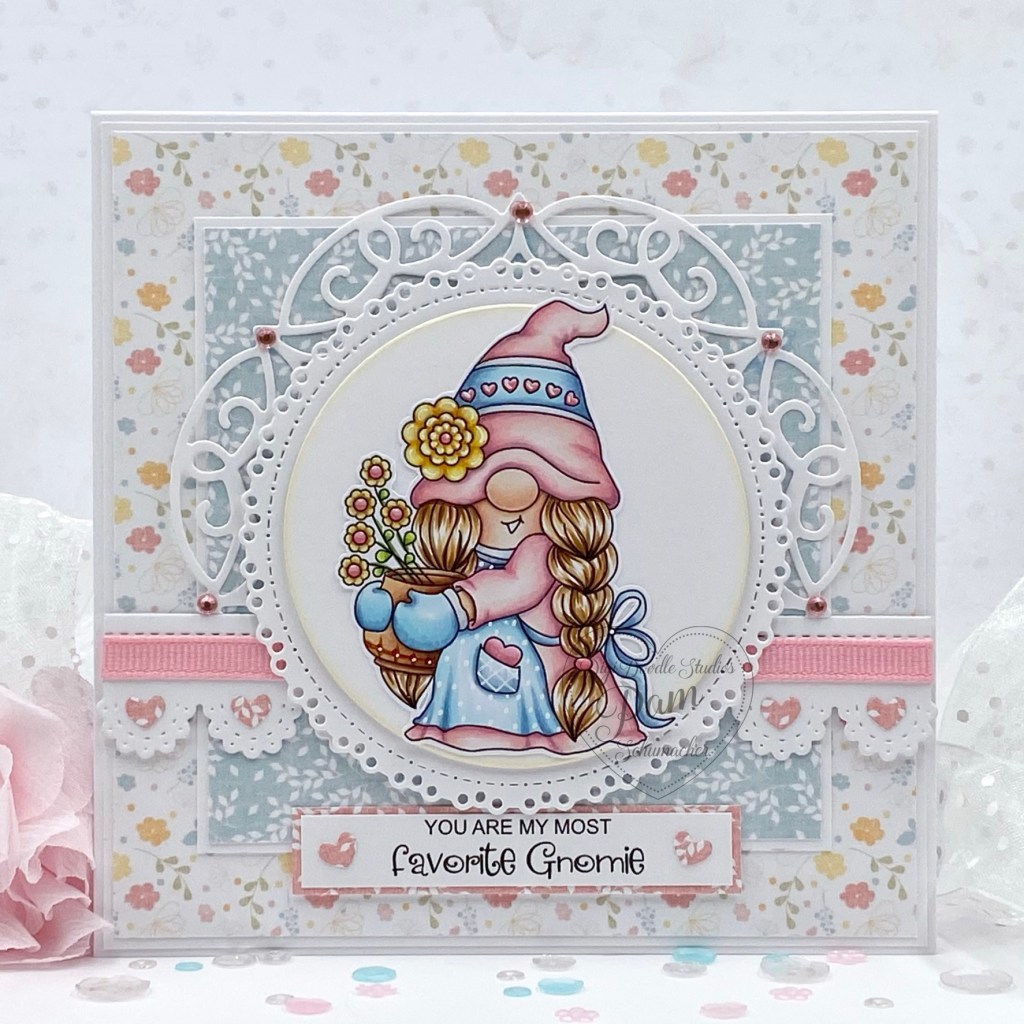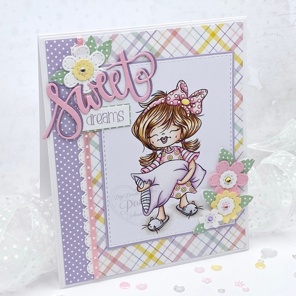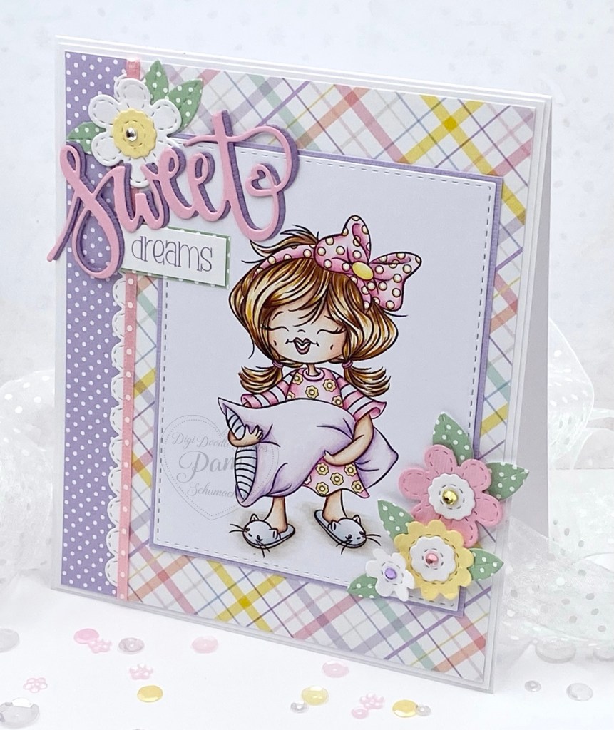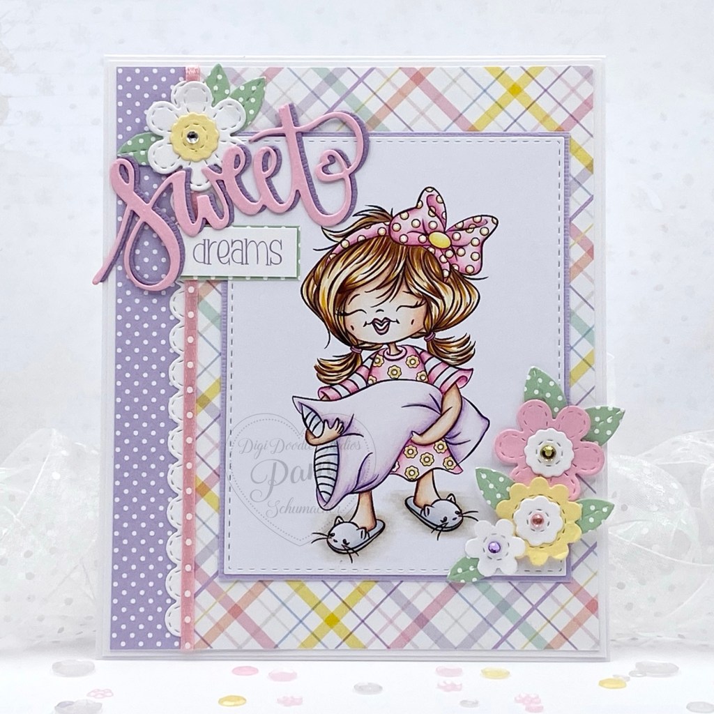 I added a sentiment and then printed this sweetheart on plain white cardstock and colored her with the following colored pencils.