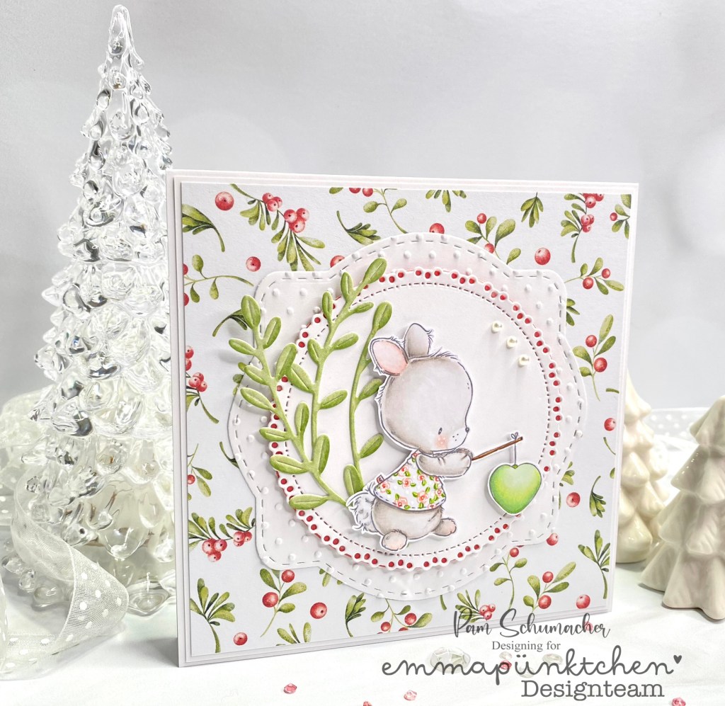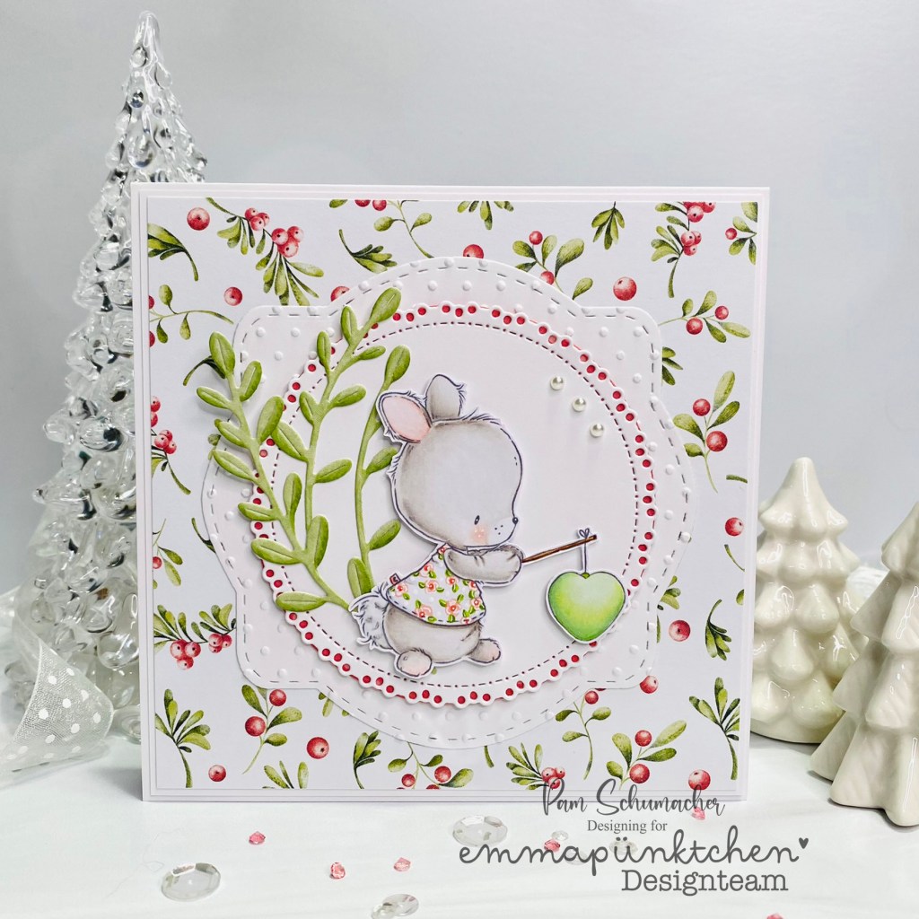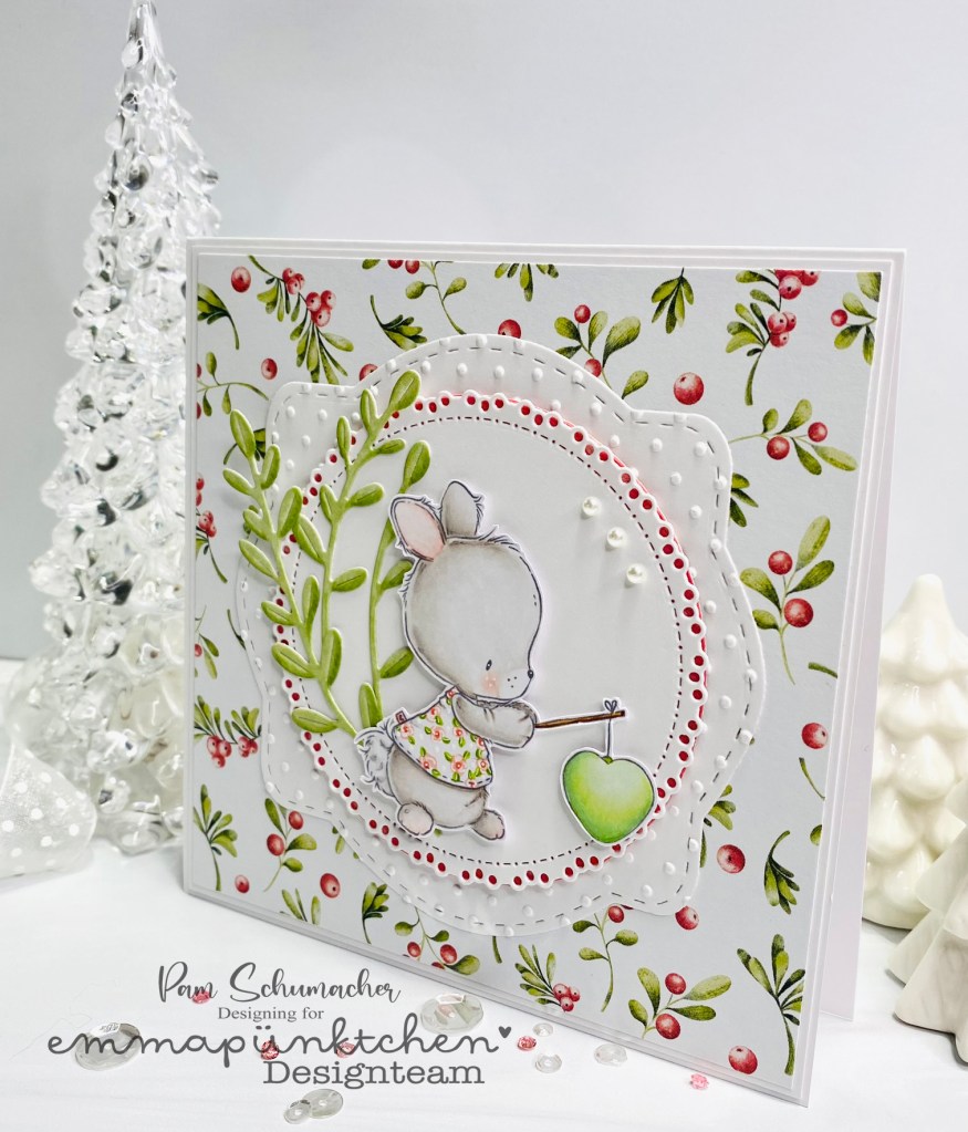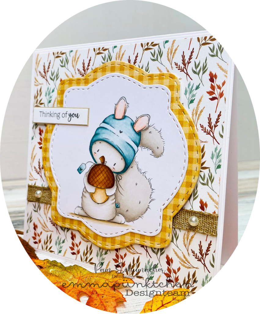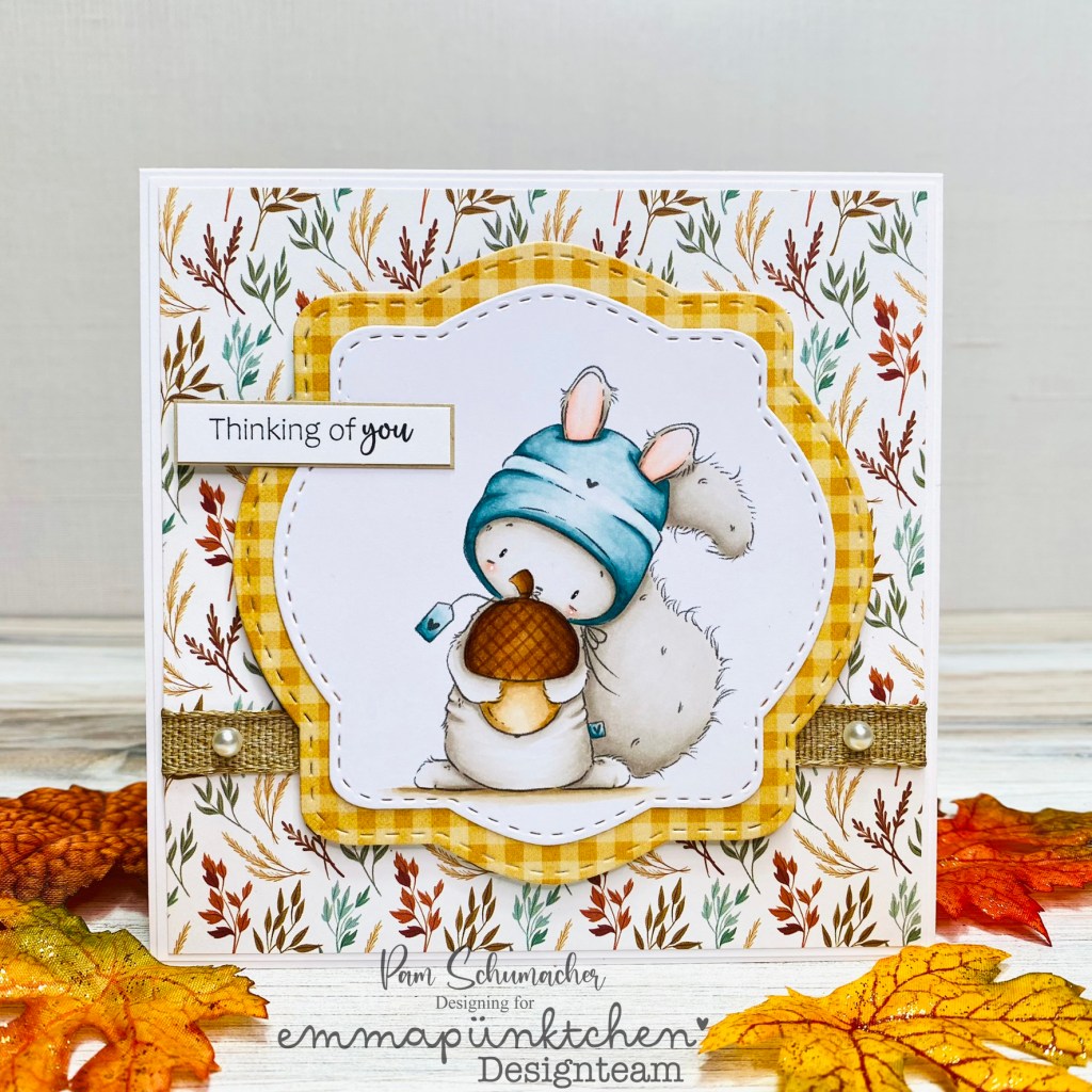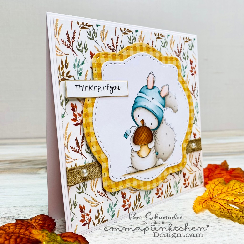 My card today features this adorable bushy tail cutie from Emma Punktchen Digital Stamps called Kusschen Nusschen. Look how proud he is of the acorn he found!!