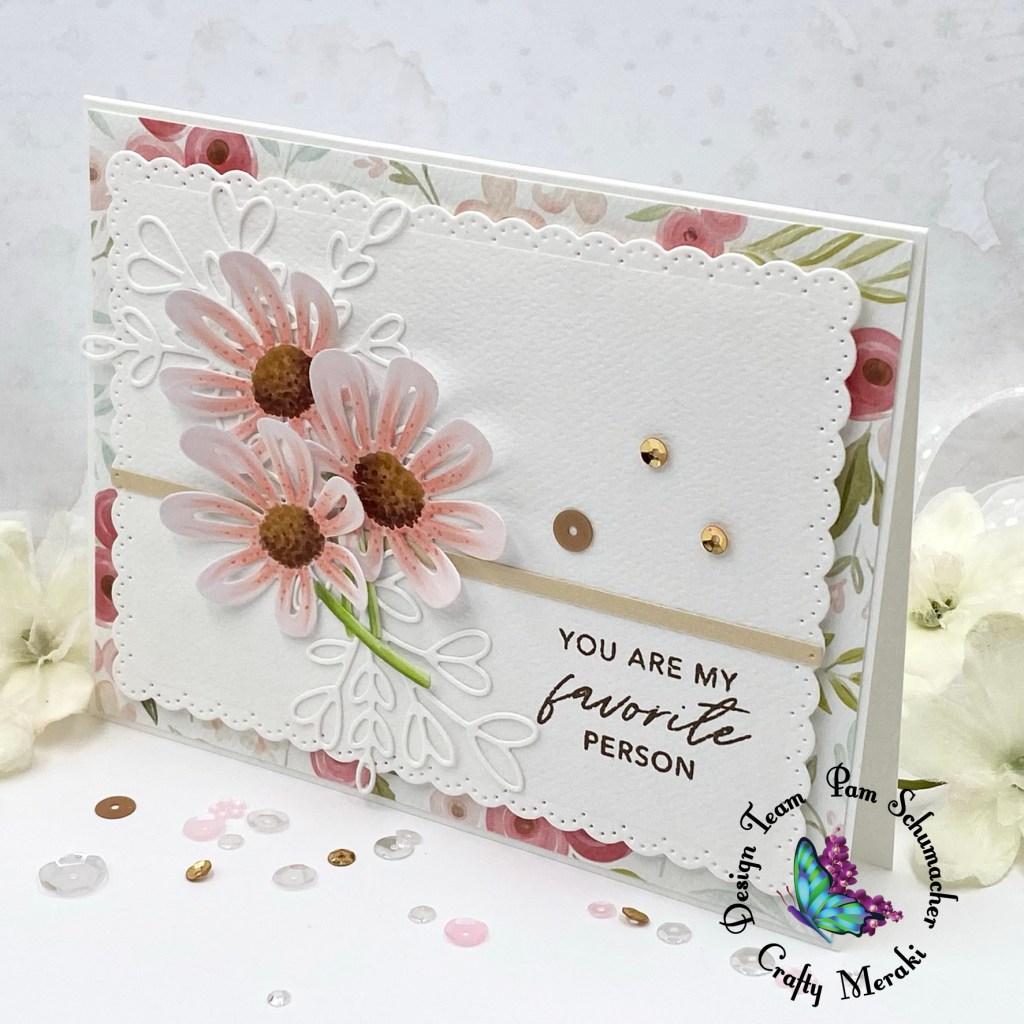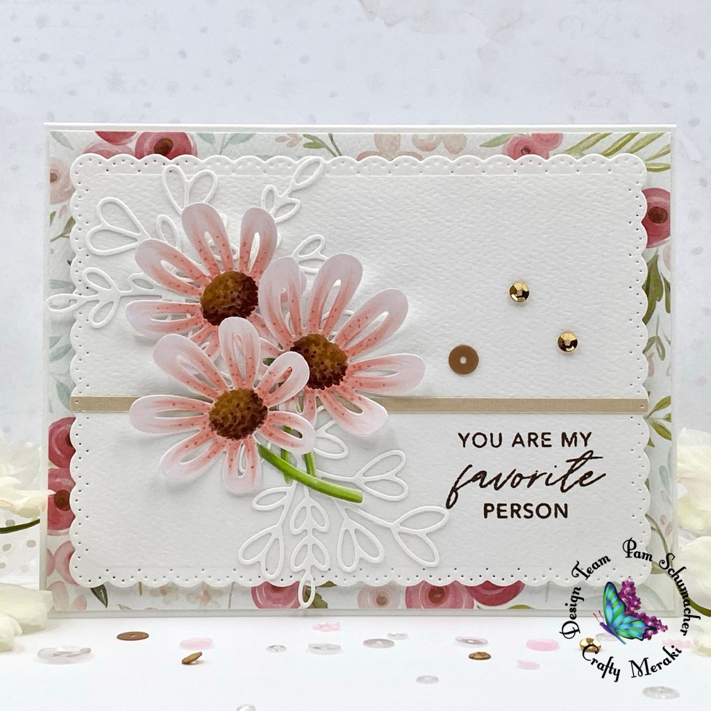 My card base is 1/8″ larger than the die cut to give it the look of being layered. I added a patterned paper behind the flowers to add a little bit of visual interest. The sentiment was stamped from the Thanks Bunches Clear Stamp Set.