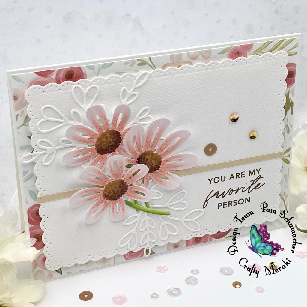 I’m sending everyone flowers to brighten their day! I love purple flowers, but sadly they are hard to find in some varieties. The great thing about sending handmade cards is you can color the flowers any color you wish.