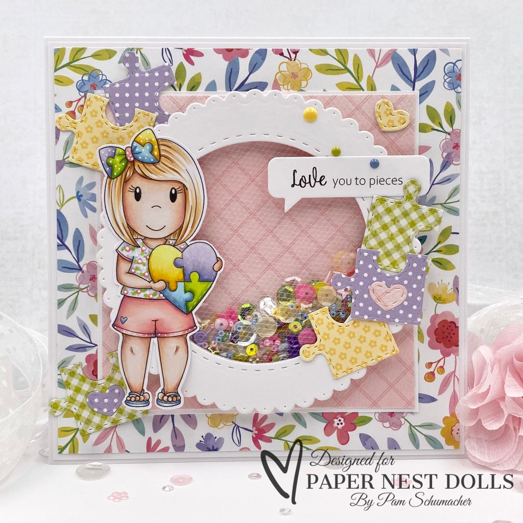 I started my card with a card base of 6-3/8″ x 3-5/8″. Next using the 3 Room Studio Mini Slimline die, I cut one from blue dotted paper and three from white card stock to give some depth for the shaker element. I used tulle for the shaker windows to give the card a softer feel, sandwiching it between the blue and one white die cut. The remaining two were glued together and attached to the card base. I then added the white stitched center pieces to the card, added bling confetti, and adhered the top section to the bottom piece with foam tape.